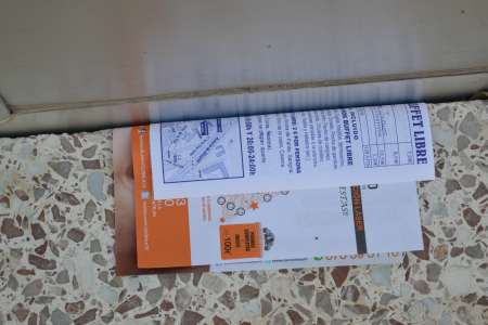 Fullets publicitaris dipositats al portal d’una casa. El fullet de color blau correspon al restaurant WokMixi, de Villena. El fullet proporciona la llista de plats, la localització del establiment, els preus al local i per al servei a domicili, l’horari d’obertura i els telèfons de contacte. Els fullets restants pertanyen a la Clínica10, de Castalla. Es pot consultar ací l’entrada sobre la publicitat de la Clínica10.
