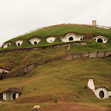 El útimo día en Nueva Zelanda hicimos la visita de rigor a Hobbiton. Es el decorado natural donde se grabó LOTR, la primera película (la parte de la comarca) y el final de la tercera parte. Se encuentra en Matamata. Desde allí hay que contratar un tour (no se puede hacer por libre) para que te lleven. Hobbiton se encuentra dentro de una propiedad privada, una granja. Peter Jackson estuvo buscando con helicóptero un sitio donde no se vieran rastros de civilización y este sitio era ideal. También proporcionaba un sitio estratégico para mantener las grabaciones en secreto. La armada neozelandesa fue contratada para crear carreteras hacia el sitio y para proporcionar la infraestuctura necesaria para mantener a más de 400 personas durante el rodaje (más de tres meses). Los detalles que nos dieron sobre el rodaje eran increíbles. Algunas de las escenas, que duraban sólo apenas unos segundos, implicaban una movilización de cientos de personas, cerca de un año de preparación y mucho dinero, todo para intentar ser lo más fiel al libro original. Como ejemplo, contrataron a más de 20 jardineros que quitaron matorrales y ciertas plantas, las trasplantaron a otro sitio y pusieron las que se iban a usar durante el rodaje. Cuando terminó, volvieron a plantar las originales. También las vallas que delimitan el terreno las quitaron y pusieron otras, reponiendo las originales cuando acabó el rodaje.